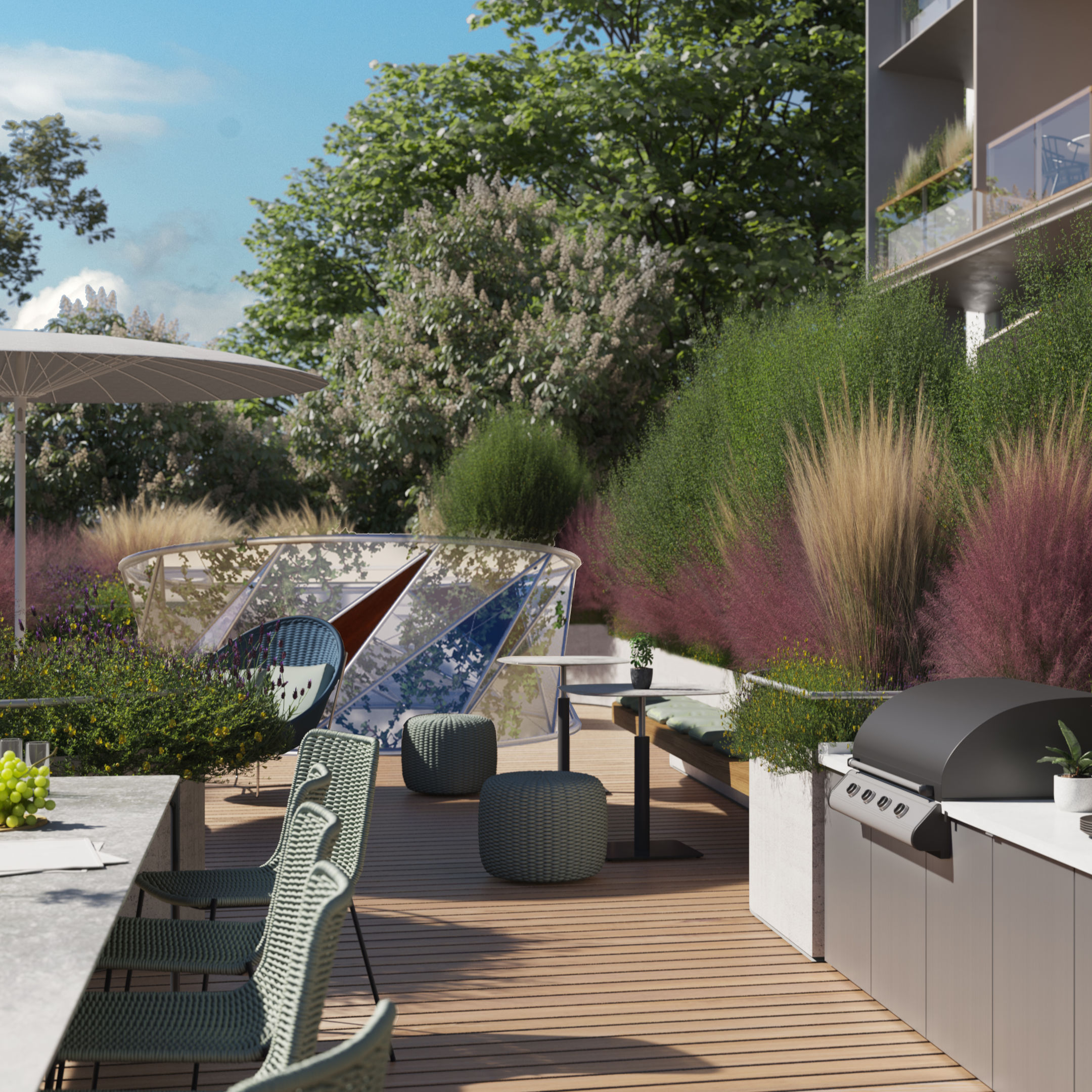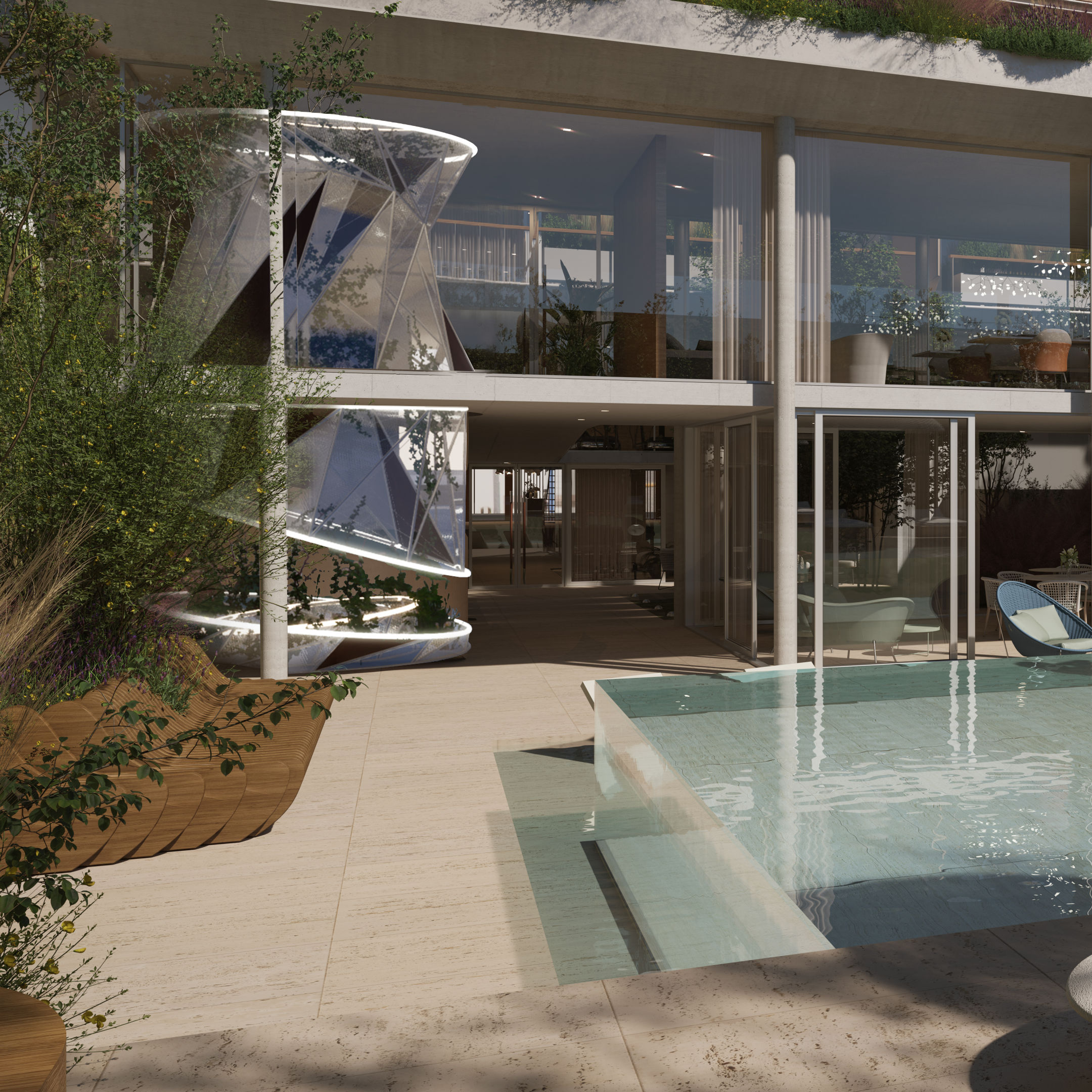 Donna Magna establece con la naturaleza una relación profunda que se torna mas expresiva en los espacios comunes. El abrazo de Deméter resignifica esta relación con una forma que se altera en el tiempo acompañando al clima y a las estaciones del año.