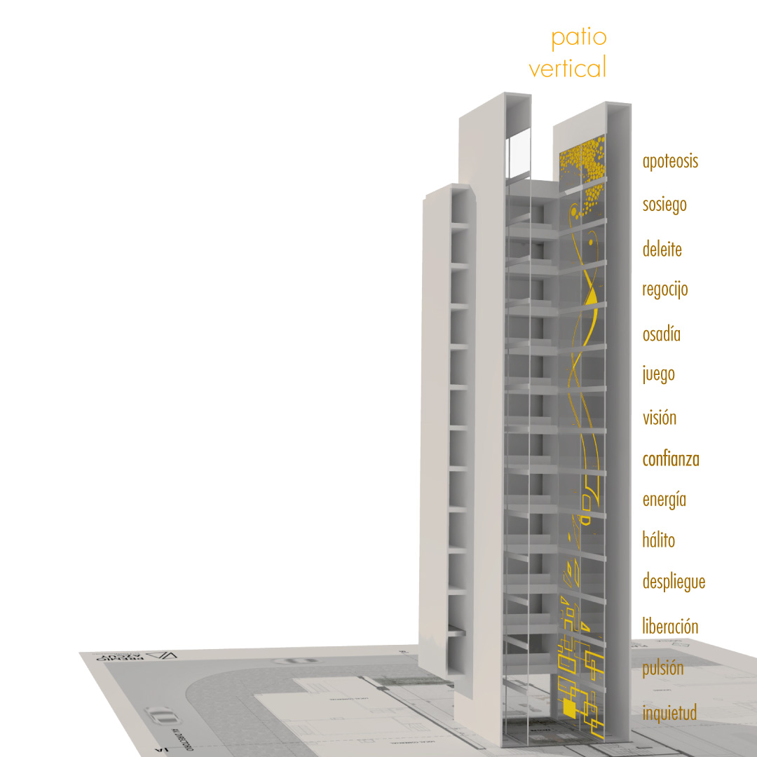 Donna Reggia establece con el sol una relación profunda, que se torna más íntima y reflexiva a medida que se asciende por el patio vertical. El sueño de Ícaro acompaña esta reflexión con una forma que se desarrolla en el tiempo, durante la travesía en los ascensores.