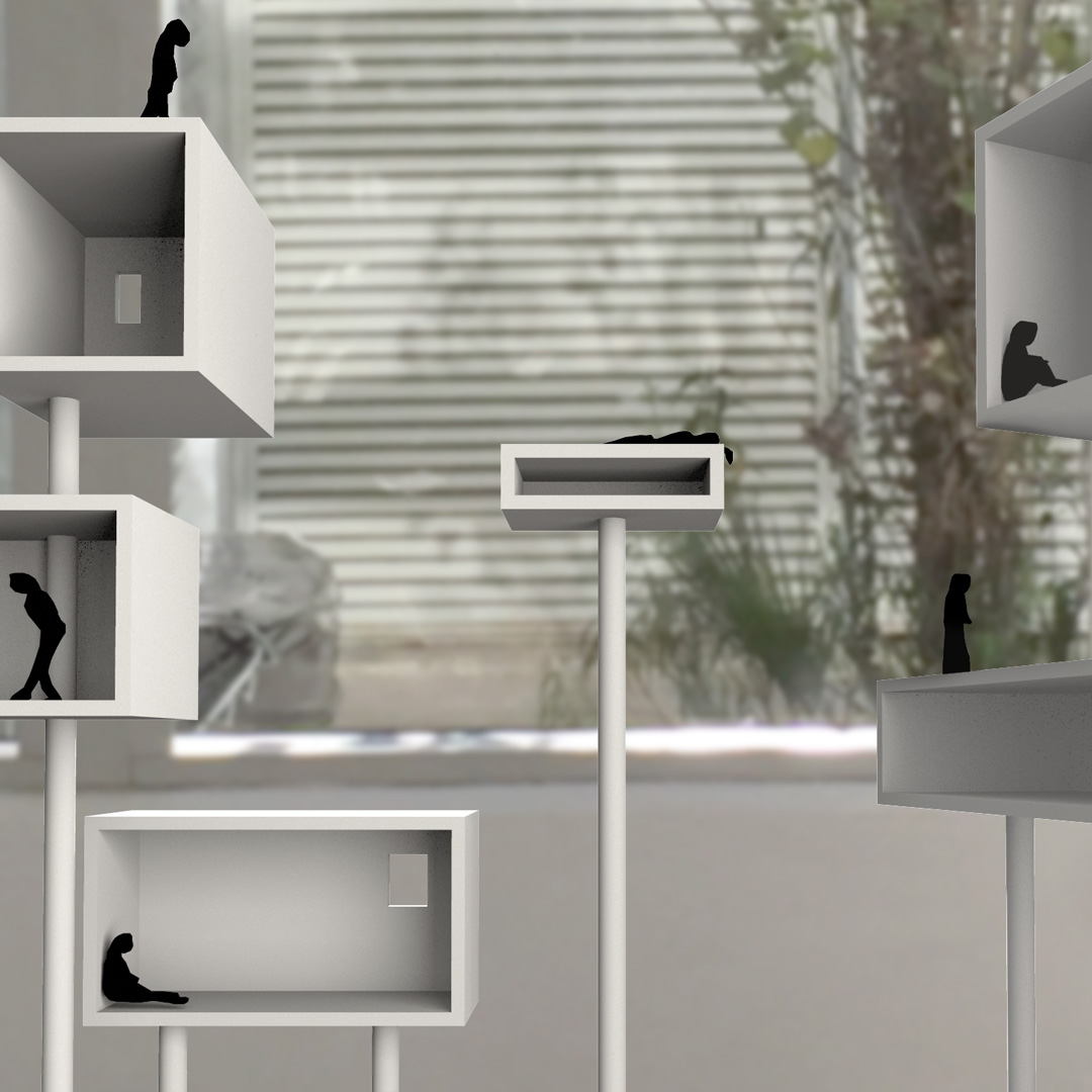 La intervención opera con geometrías, escalas, oposiciones, siluetas y sombras generando un políptico de ficciones.